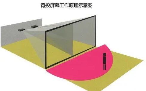 背投就是投影機(jī)的安裝位置與觀眾分別位于屏幕的二側(cè),投影機(jī)發(fā)出的光線從屏幕的一側(cè)直射到屏幕,光線透過(guò)屏幕進(jìn)入觀眾眼睛。